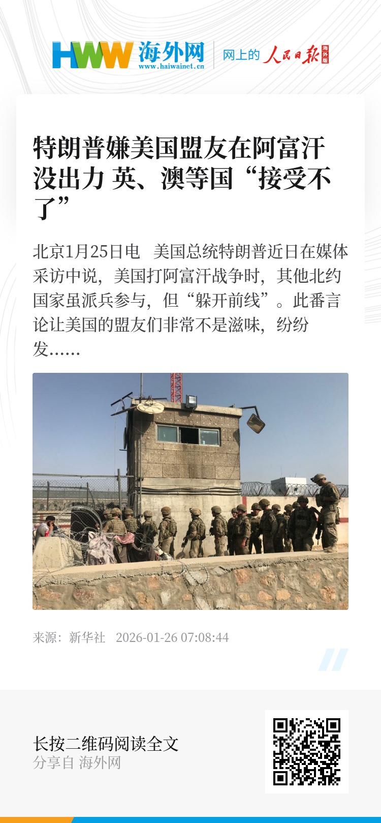 新华社北京1月25日电 美国总统特朗普近日在媒体采访中说,美国打阿富汗战争时,其他北约国家虽派兵参与,但“躲开前线”。此番言论让美国的盟友们非常不是滋味,纷纷发声反驳。澳大利亚总理阿尔巴尼斯25日说,这种说法“完全不恰当,完全不可接受”,他间接呼吁特朗普“尊重”盟友军队的付出。