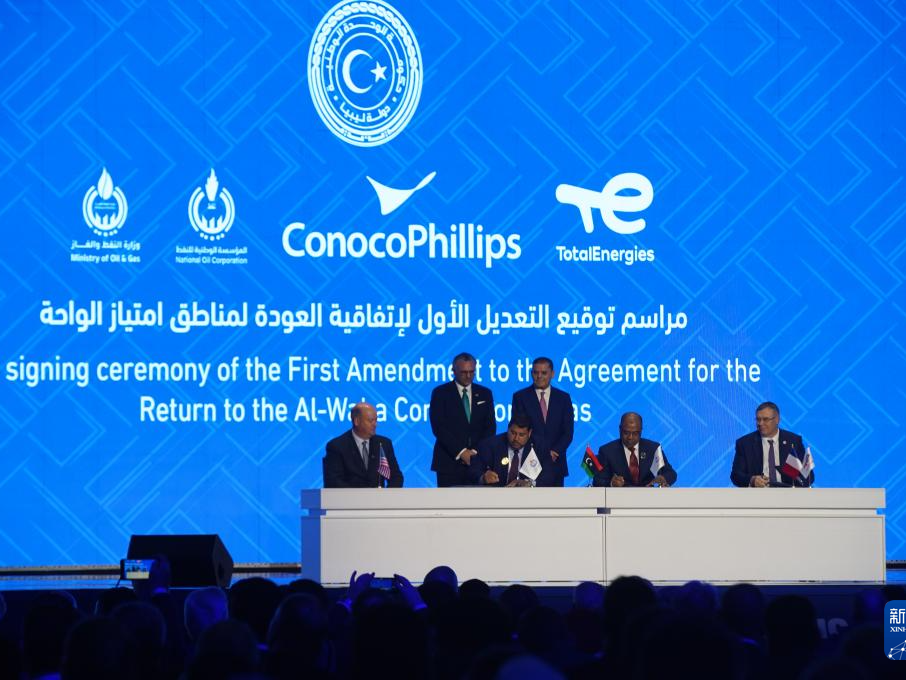 1月24日,在利比亚首都的黎波里,利比亚与法国道达尔能源公司和美国康菲石油公司举行协议签字仪式。新华社发(哈泽姆·图尔基亚摄)