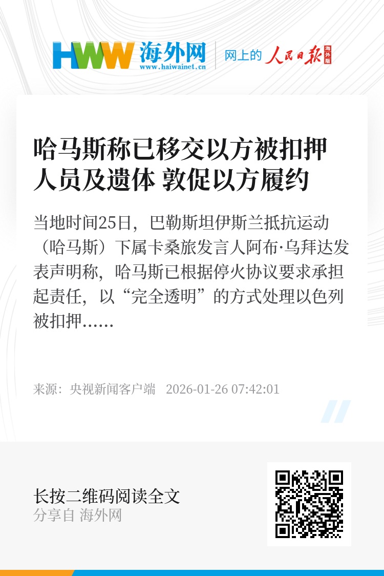 阿布·乌拜达表示,尽管以色列方面未履行承诺,并数十次违反协议、实施袭击,但卡桑旅仍在极其复杂的条件下完成了遗体搜寻和移交工作。他强调,卡桑旅希望尽快彻底结束这一议题,并呼吁相关斡旋方承担责任,督促以色列执行协议内容。