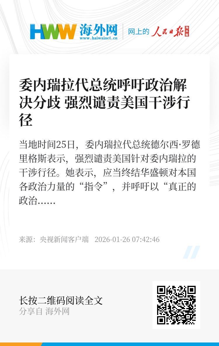 罗德里格斯强调,委内瑞拉具备足够的制度成熟度和政治能力,能够在不受外国“监督”的情况下,自主处理本国事务。(总台记者 宫祥诚)