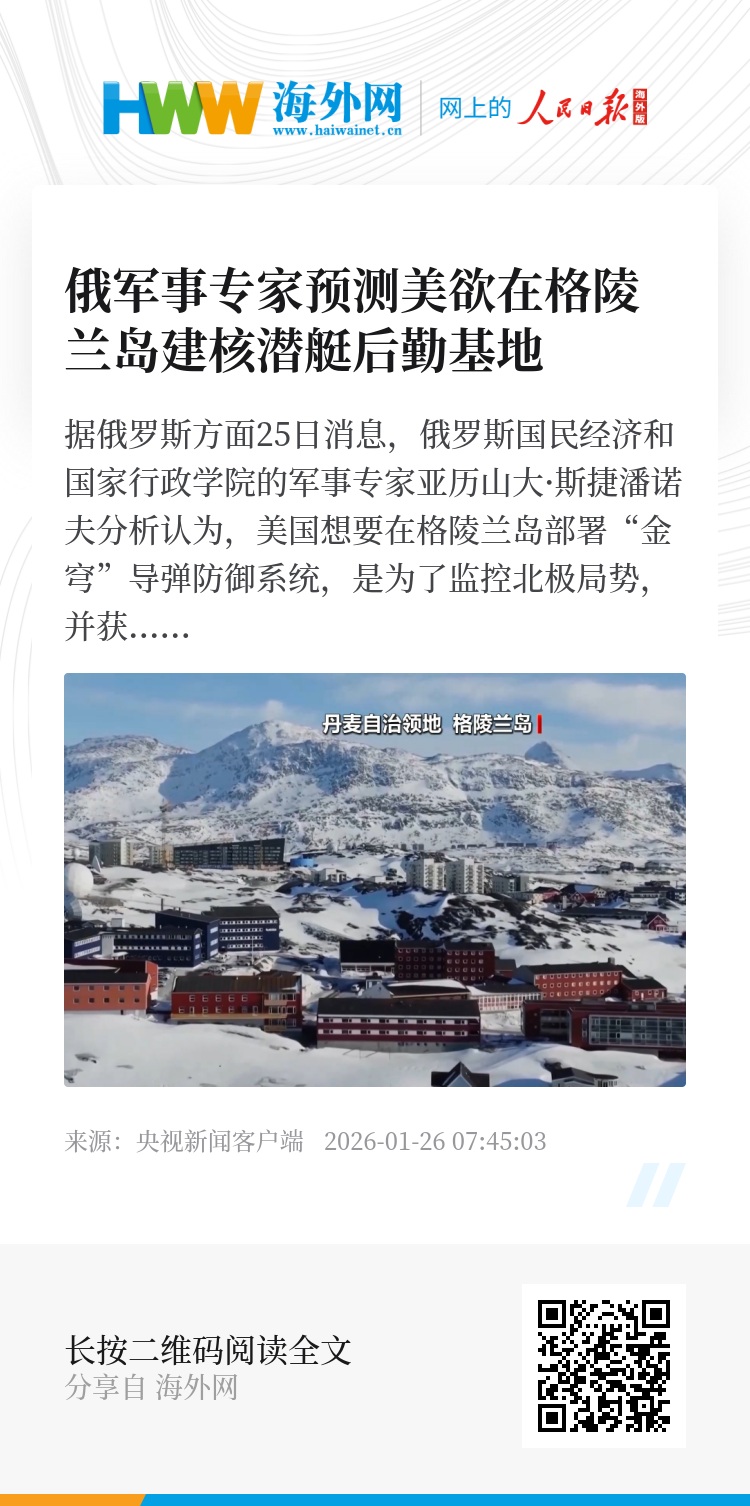 据俄罗斯方面25日消息,俄罗斯国民经济和国家行政学院的军事专家亚历山大·斯捷潘诺夫分析认为,美国想要在格陵兰岛部署“金穹”导弹防御系统,是为了监控北极局势,并获取拦截俄罗斯高超音速武器的能力。