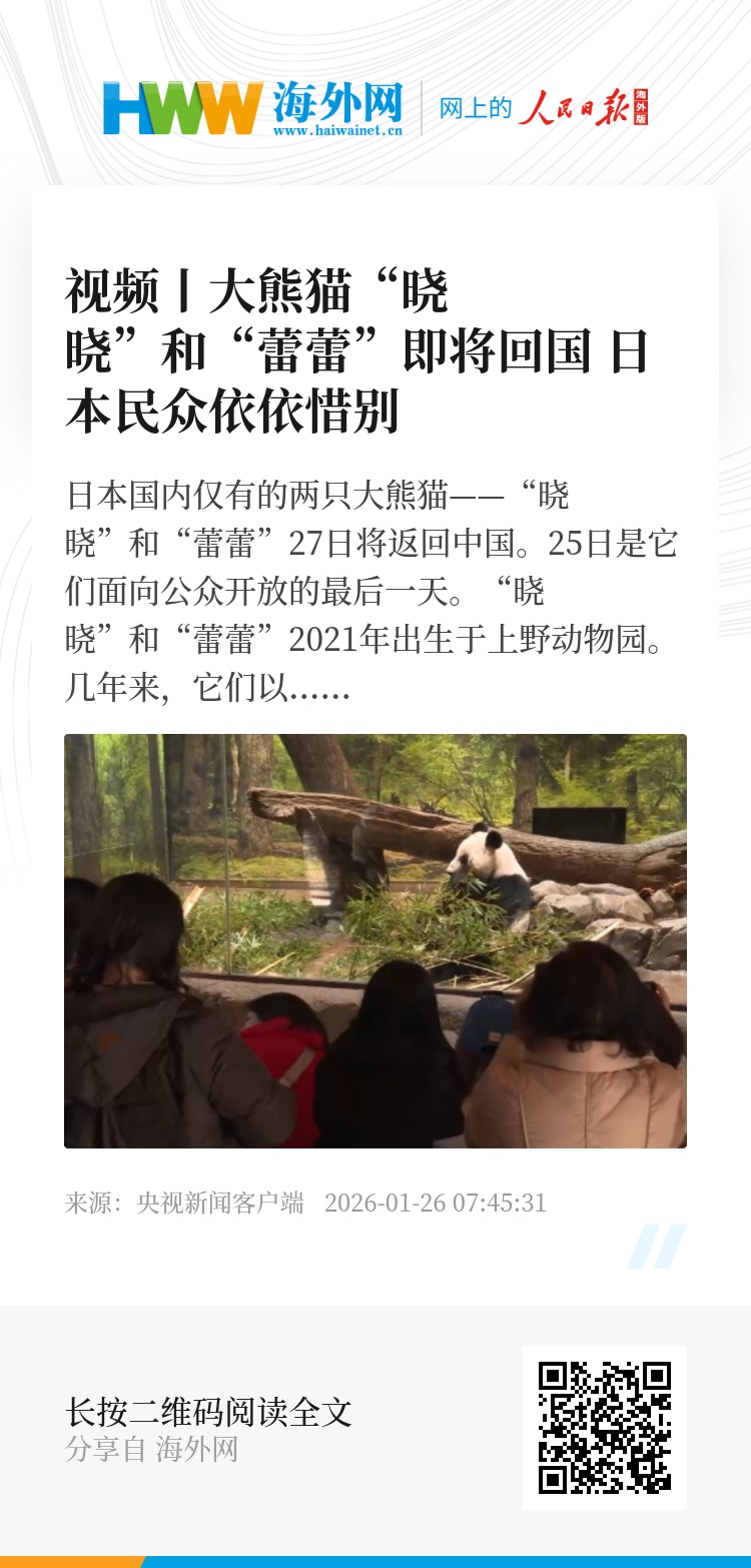 总台记者 刘耀鸿:在我身后,是大熊猫“晓晓”和“蕾蕾”生活的大熊猫馆。可以看到,现在已经有不少日本民众在这里排队等候。最后一天开放日,上野动物园通过提前抽签的方式,向约4400名日本民众开放了返回中国前的最后参观名额,有不少大熊猫爱好者虽然未能抽中观览资格,但也依然专程从日本各地赶来送别“晓晓”和“蕾蕾”。