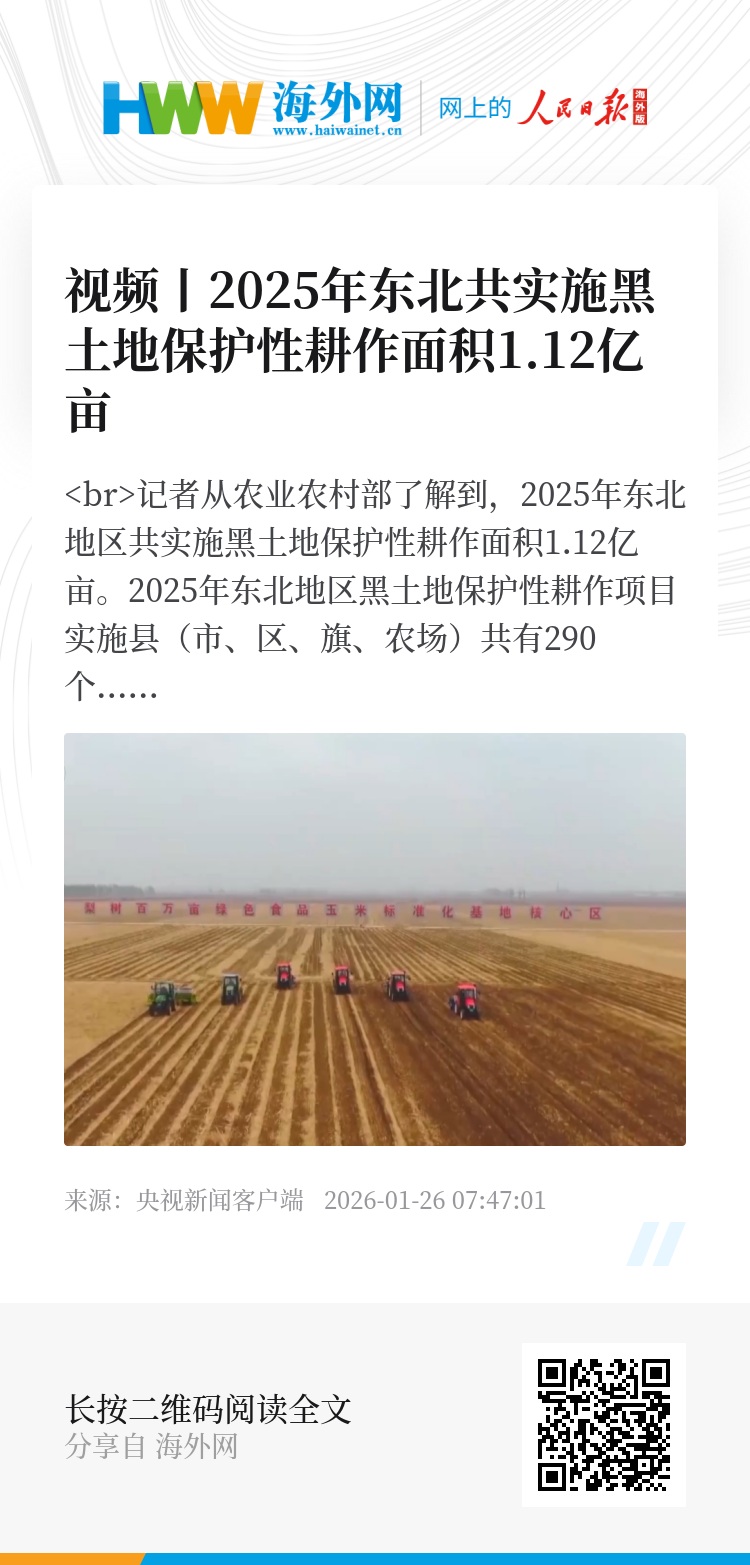 记者从农业农村部了解到,2025年东北地区共实施黑土地保护性耕作面积1.12亿亩。