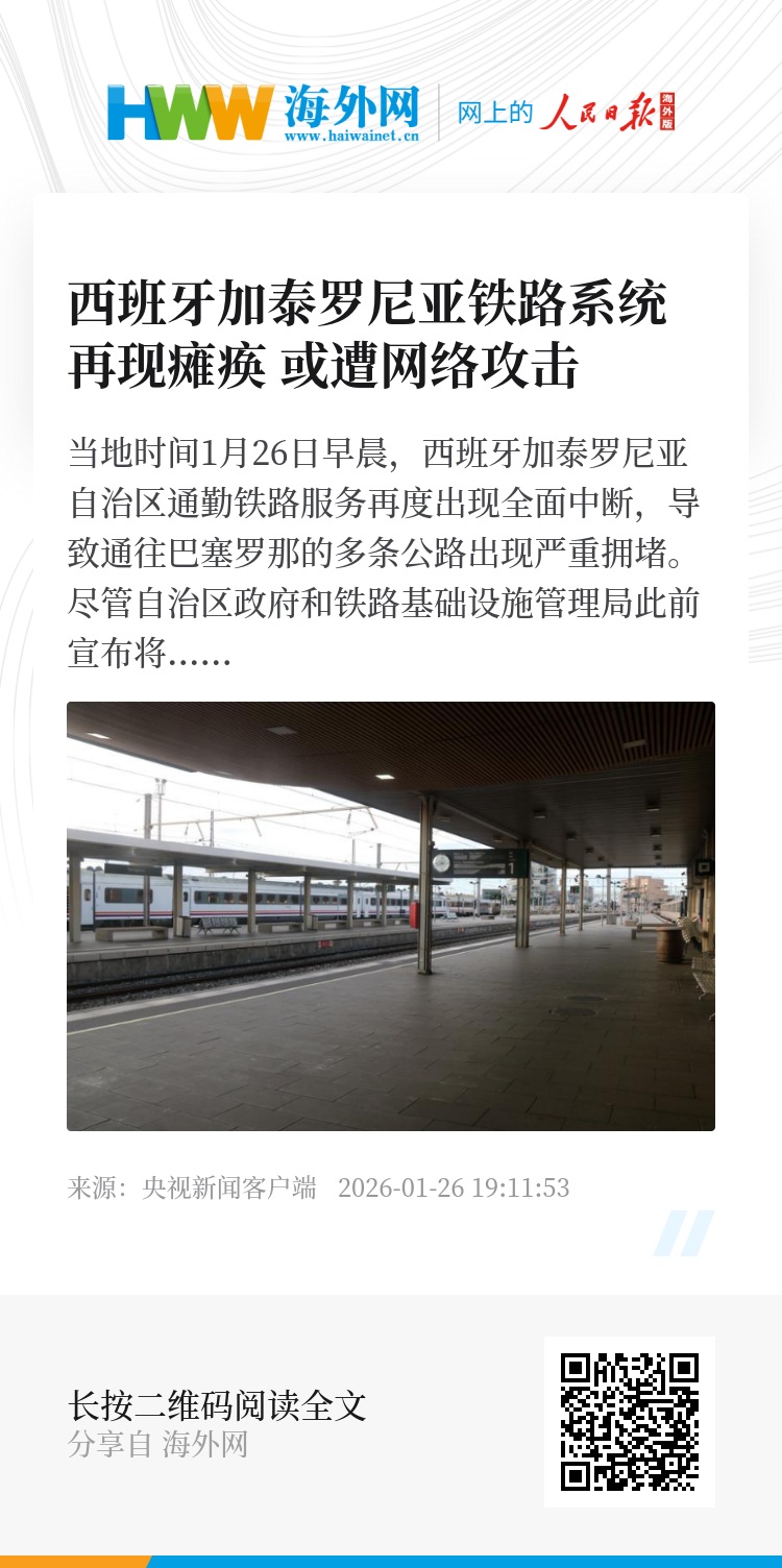 当地时间1月26日早晨,西班牙加泰罗尼亚自治区通勤铁路服务再度出现全面中断,导致通往巴塞罗那的多条公路出现严重拥堵。尽管自治区政府和铁路基础设施管理局此前宣布将部分恢复通勤铁路网运行,但两小时内铁路控制中心发生两次系统瘫痪。