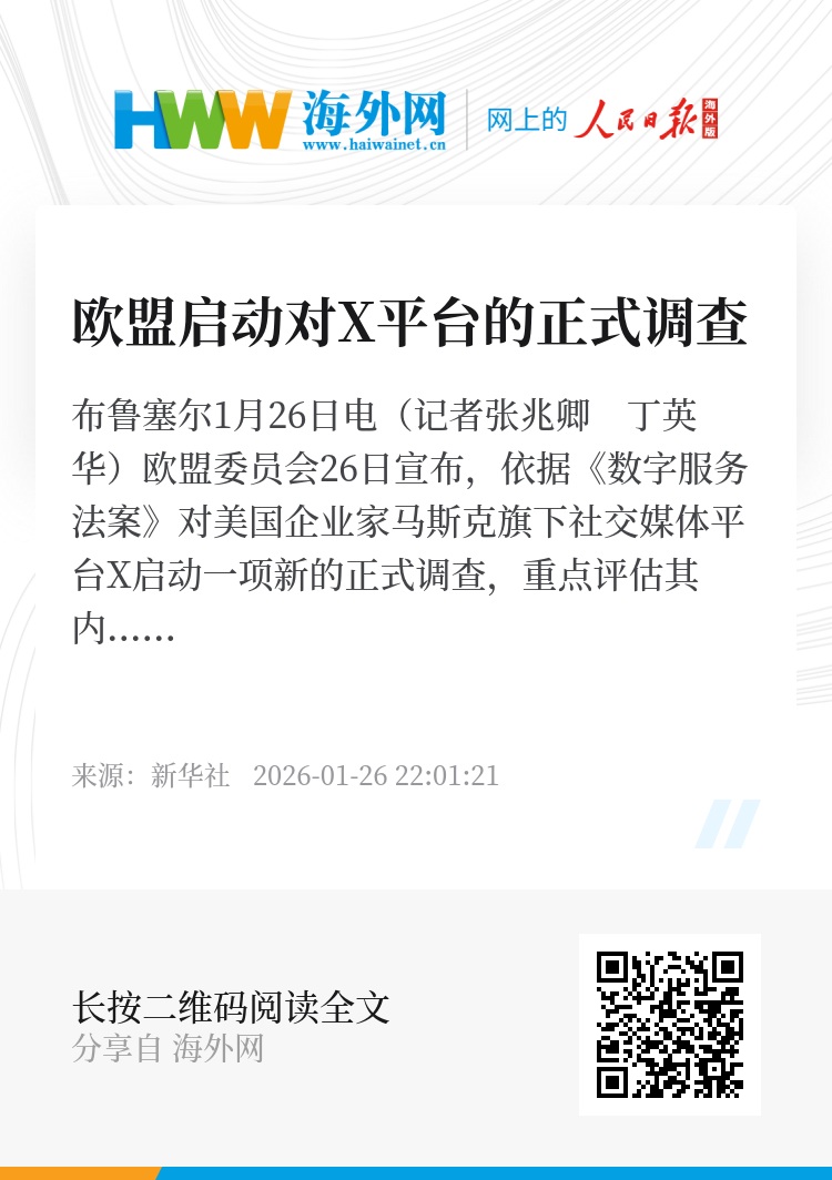 新华社布鲁塞尔1月26日电(记者张兆卿 丁英华)欧盟委员会26日宣布,依据《数字服务法案》对美国企业家马斯克旗下社交媒体平台X启动一项新的正式调查,重点评估其内置的人工智能聊天机器人“格罗克”可能引发的风险。