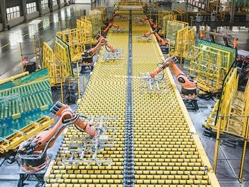江苏省宿迁市宿豫区一家新材料公司生产车间内,工业机器人在生产线上自动堆垛玻璃产品。薛金龙摄(人民视觉)