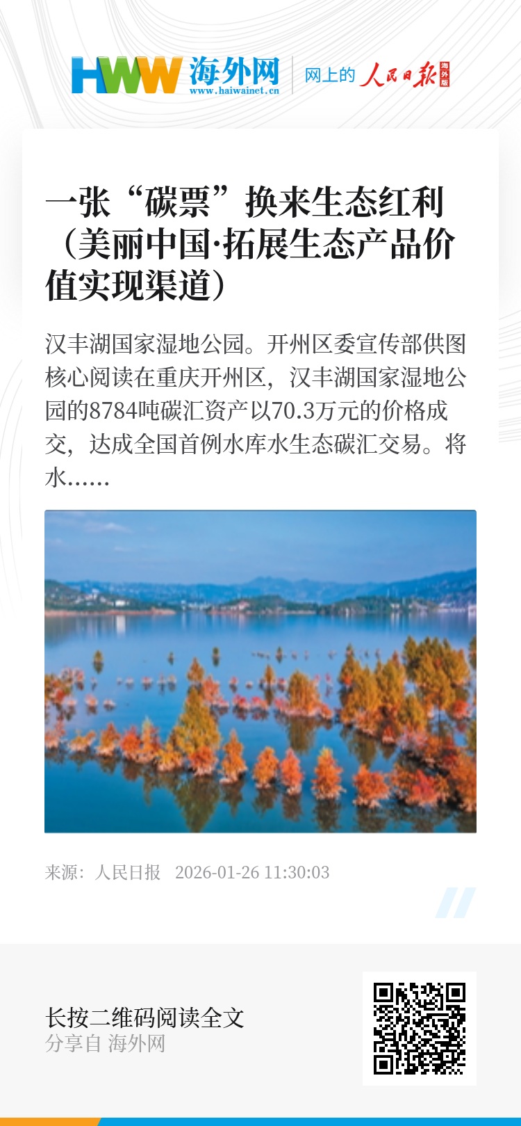 在重庆开州区,汉丰湖国家湿地公园的8784吨碳汇资产以70.3万元的价格成交,达成全国首例水库水生态碳汇交易。将水生态修复效益转化为可量化的碳资产,为全国水库水生态价值实现提供了可借鉴的案例,也为长江经济带生态修复与碳汇能力提升开辟了新路径。
