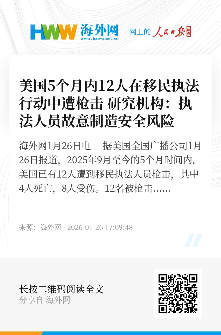 海外网1月26日电 据美国全国广播公司1月26日报道,2025年9月至今的5个月时间内,美国已有12人遭到移民执法人员枪击,其中4人死亡,8人受伤。