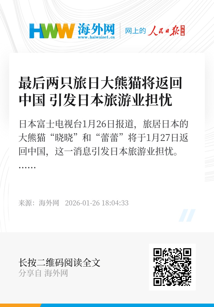 海外网1月26日电 日本富士电视台1月26日报道,旅居日本的大熊猫“晓晓”和“蕾蕾”将于1月27日返回中国,这一消息引发日本旅游业担忧。