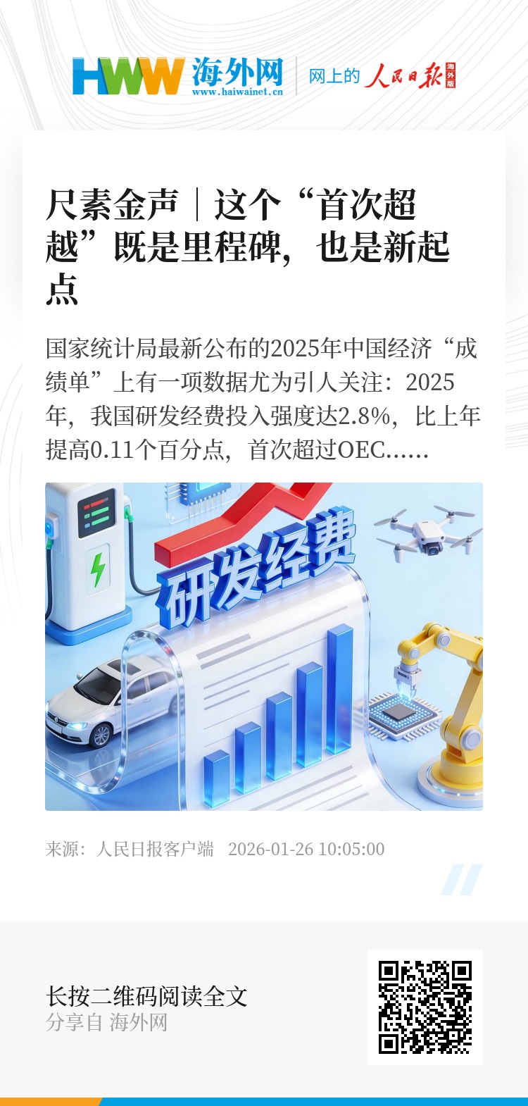 国家统计局最新公布的2025年中国经济“成绩单”上有一项数据尤为引人关注:2025年,我国研发经费投入强度达2.8%,比上年提高0.11个百分点,首次超过OECD(经济合作与发展组织)国家平均水平。