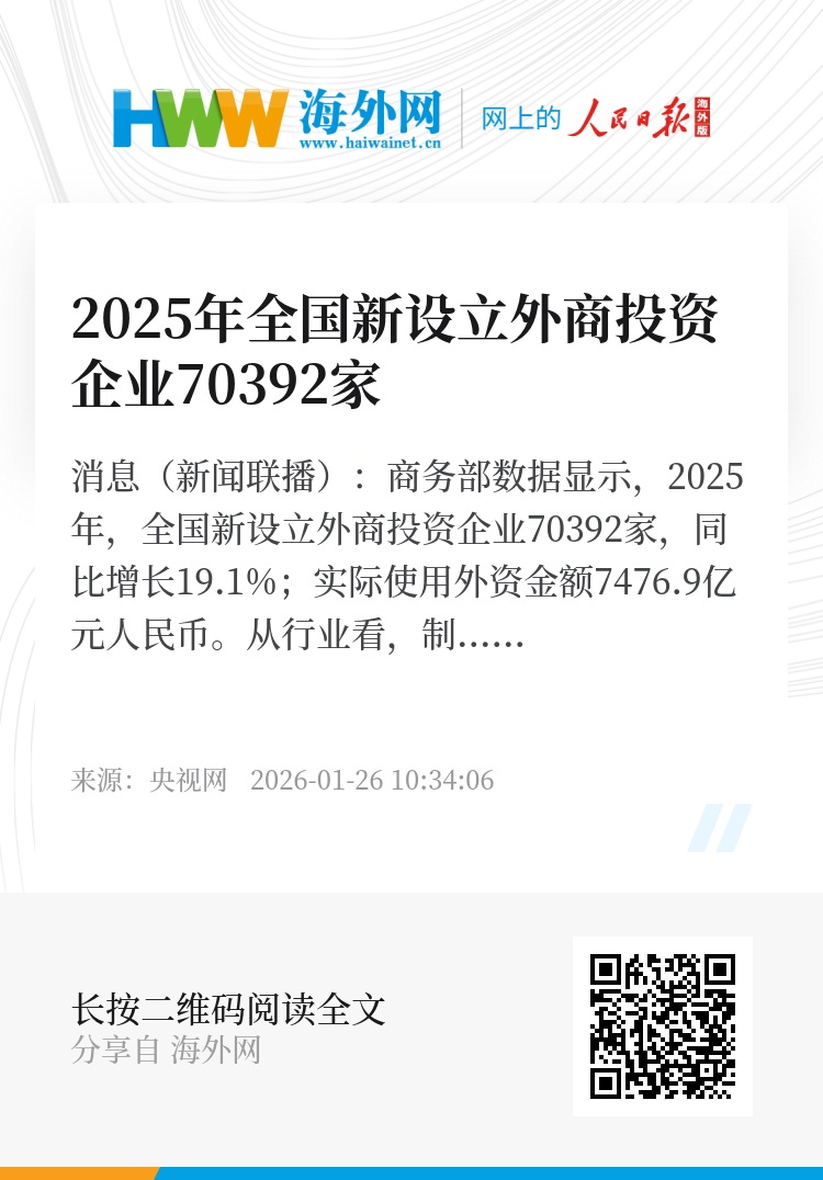 央视网消息(新闻联播):商务部数据显示,2025年,全国新设立外商投资企业70392家,同比增长19.1%;实际使用外资金额7476.9亿元人民币。