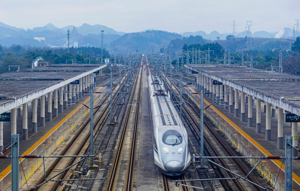 ↑ 1月25日,动车组列车经过贵州黔西高铁站。新华社发(范晖 摄)
