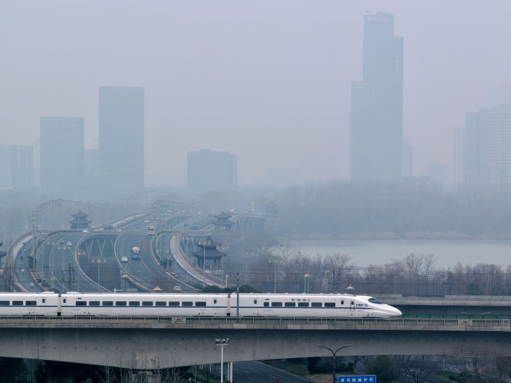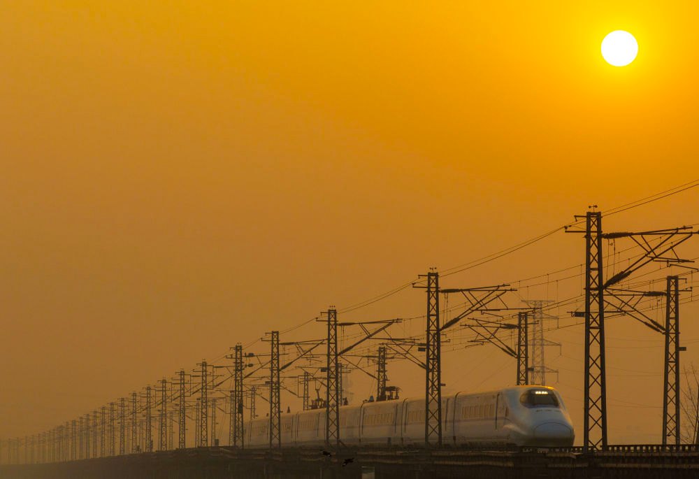↑ 1月25日,一列动车组列车在河北省石家庄市境内行驶。新华社发(梁子栋 摄)