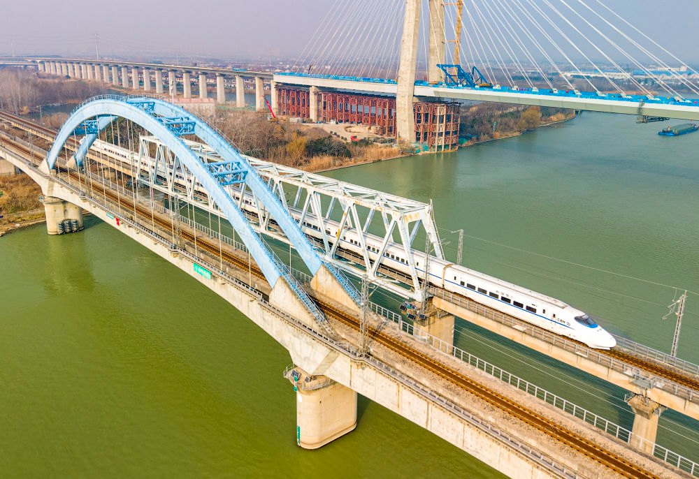 ↑ 1月25日,列车行驶在江苏省泰州市海陵区境内(无人机照片)。新华社发(汤德宏 摄)