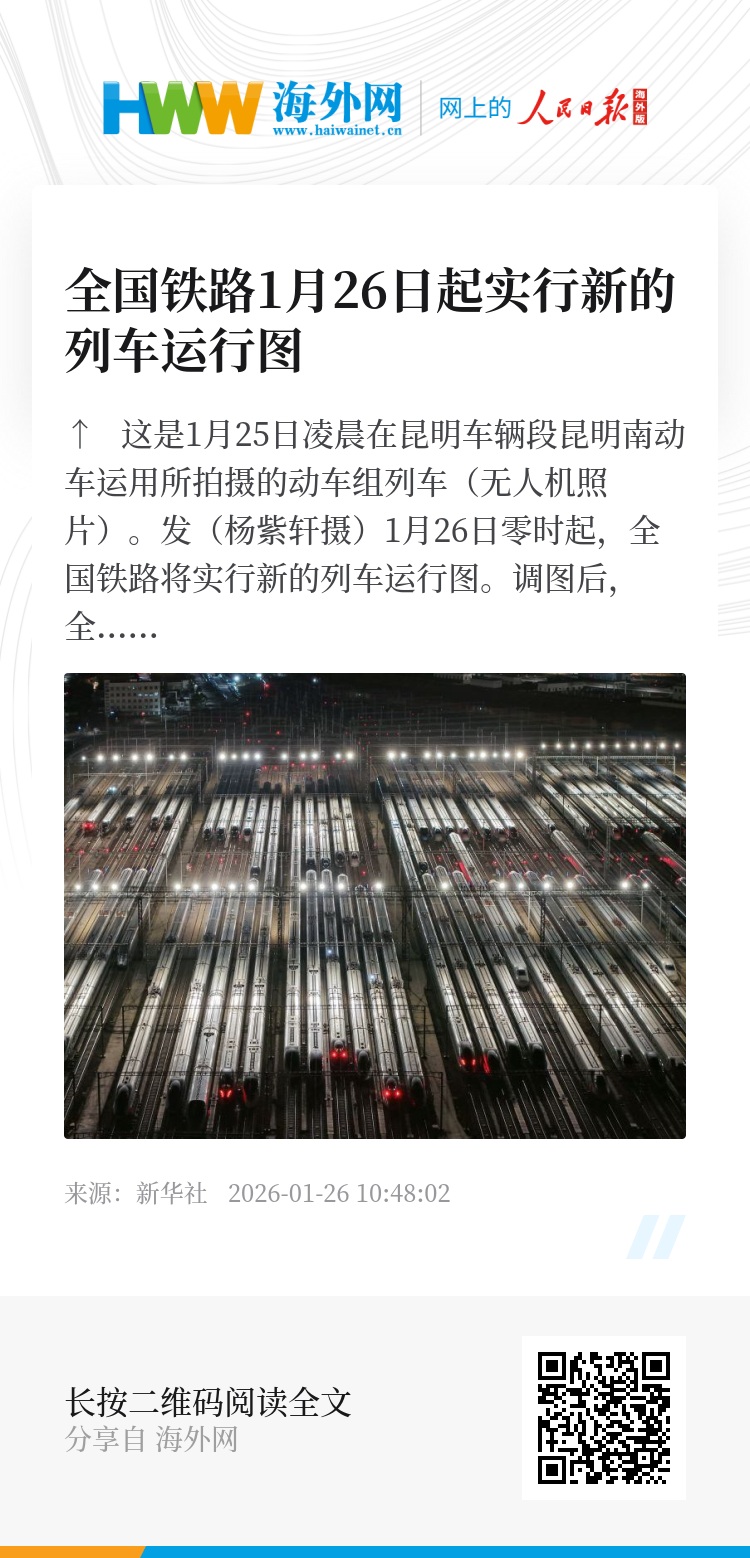 1月26日零时起,全国铁路将实行新的列车运行图。调图后,全国铁路将安排图定旅客列车12130列,较现图增加243列,开行货物列车23748列,较现图增加177列,全国铁路客货运输能力和效率进一步提升,运输产品供给持续优化,将更好地服务经济社会高质量发展。