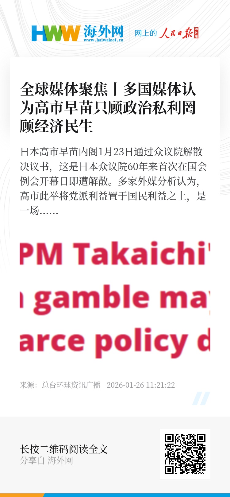 日本高市早苗内阁1月23日通过众议院解散决议书,这是日本众议院60年来首次在国会例会开幕日即遭解散。多家外媒分析认为,高市此举将党派利益置于国民利益之上,是一场罔顾经济民生的“政治赌博”。