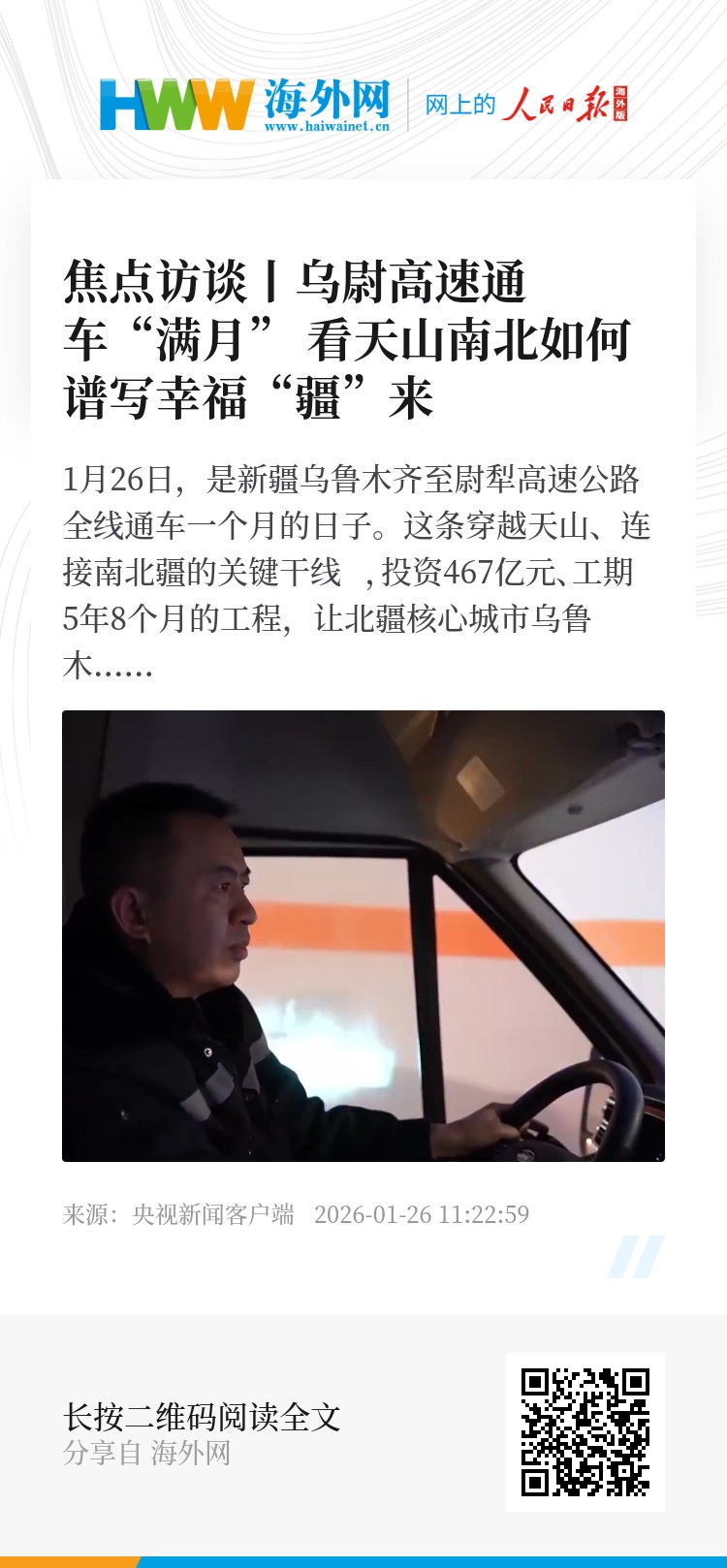 乌尉高速公路是一条方便大家出行的“幸福路”,也是一条加强南北疆经济联系、推进区域协调发展的“致富路”。这条路还是一座连心桥,促进各民族团结交融。从7小时到3.5小时,不仅仅是效率上的变化,更让人看到了活力、动力和潜力。有了它,天山南北将会迎来更加美好的未来。
