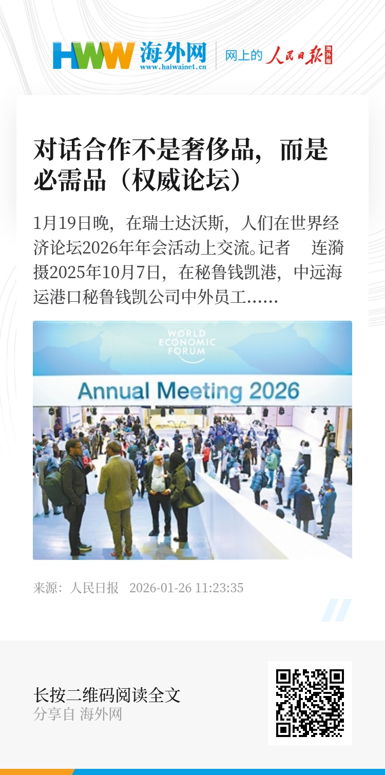近日举行的世界经济论坛2026年年会以“对话的精神”为主题,吸引全球130多个国家和地区近3000名不同领域的代表参加。各方普遍认为,尽管全球合作的图景与以往截然不同,但协作路径与对话精神依然至关重要;对话合作不是奢侈品,而是这个世界的必需品。