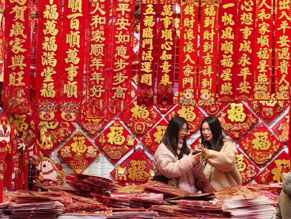 1月25日,顾客在河南省焦作市温县赵堡镇赵堡村年货市场选购春联、年画。新华社发(徐宏星摄)