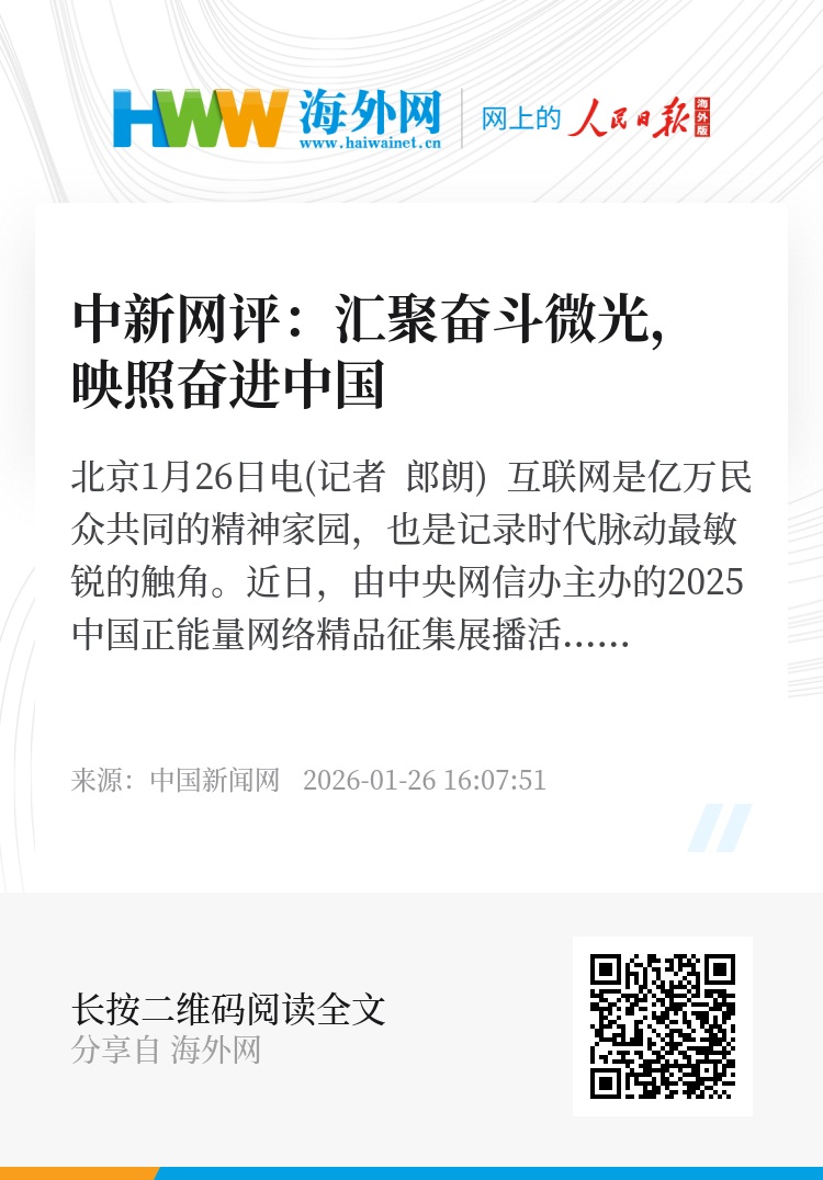 中新网北京1月26日电(记者 郎朗) 互联网是亿万民众共同的精神家园,也是记录时代脉动最敏锐的触角。近日,由中央网信办主办的2025中国正能量网络精品征集展播活动正在广泛开展。