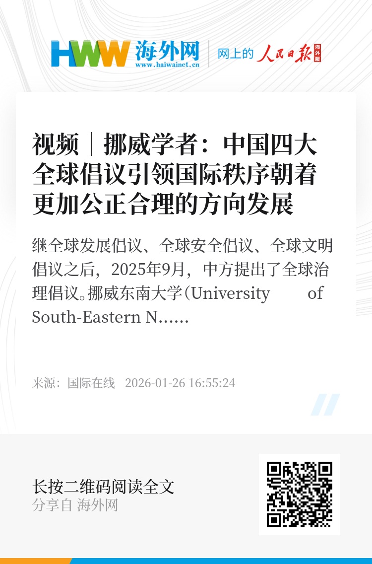 继全球发展倡议、全球安全倡议、全球文明倡议之后,2025年9月,中方提出了全球治理倡议。挪威东南大学(University of South-Eastern Norway)教授格伦·迪森(Glenn Diesen)近日在接受总台环球资讯记者专访时表示,在当前挑战与动荡交织的国际形势下,中国提出的四大全球倡议,引领国际秩序朝着更加公正合理的方向发展。