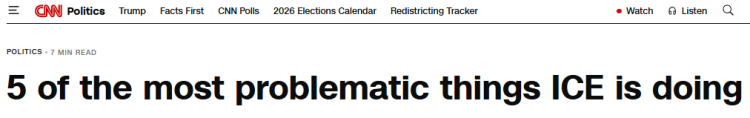 美国有线电视新闻网的报道指出,民调显示,六成美国人认为移民与海关执法局在明州的移民执法行动构成“过度执法”,但联邦政府却未作出实质性改变,还于近期公布备忘录,声称移民与海关执法局有权在没有司法机关签发“搜查令”的情况下进入民宅,此举进一步激化矛盾,加剧美国公众对该机构权力过度扩张的担忧。