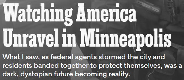 美国《纽约时报》网站近日刊登题为《眼睁睁看着美国在明尼阿波利斯分崩离析》的报道,记者深入明尼苏达州明尼阿波利斯市,报道联邦执法人员与市民的冲突,认为这是特朗普政府与美国民主“最深刻的决裂”。