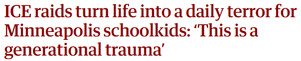 英国《卫报》网站的报道注意到,美国移民与海关执法局执法人员在明尼阿波利斯市抓捕非法移民的行动,导致当地学童陷入严重心理创伤。孩子们因害怕亲人被捕而躲藏、辍学或出现被惊吓现象。教师被迫暂停正常教学,转而教授应对联邦执法人员敲门的安全技巧,并提供线上课程,但专业课程无法远程开展,从而加剧教育的不平等。