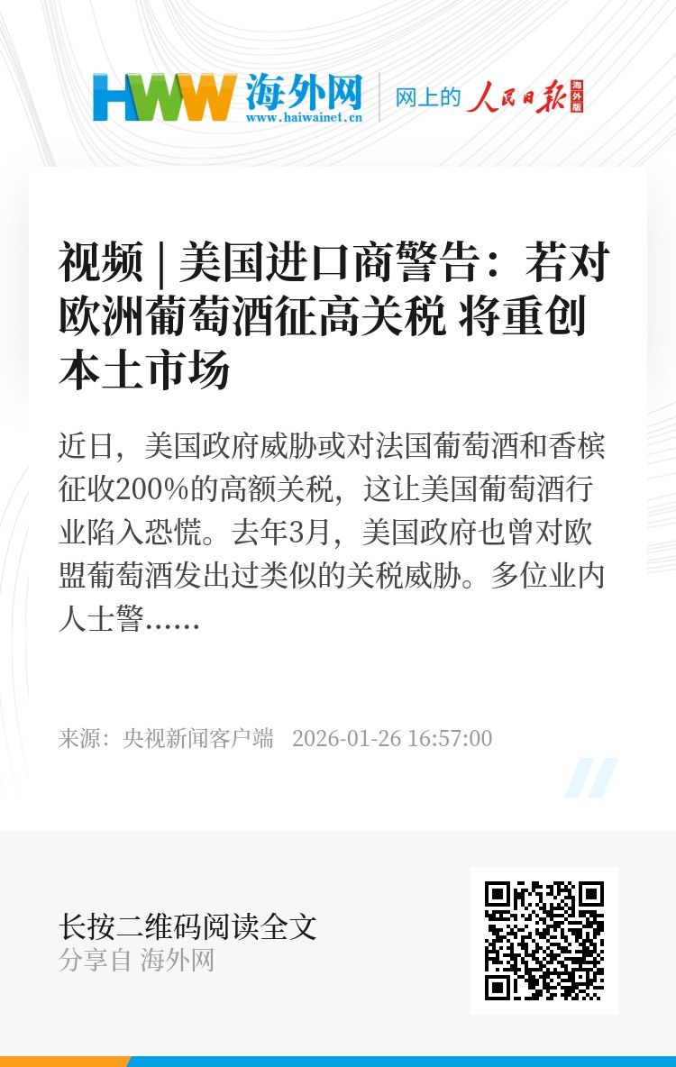 近日,美国政府威胁或对法国葡萄酒和香槟征收200%的高额关税,这让美国葡萄酒行业陷入恐慌。去年3月,美国政府也曾对欧盟葡萄酒发出过类似的关税威胁。多位业内人士警告,若对欧洲的高额关税政策落地,将重创美国葡萄酒市场。