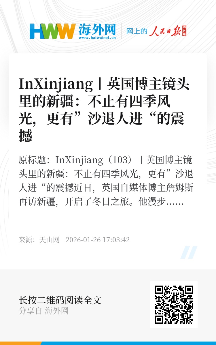 近日,英国自媒体博主詹姆斯再访新疆,开启了冬日之旅。他漫步喀什古城,感受历史温度;穿行金湖杨国家森林公园,欣赏自然生态的壮美画卷;并专程前往麦盖提县,探访防风固沙生态林,亲眼见证荒漠化作绿洲的奇迹。