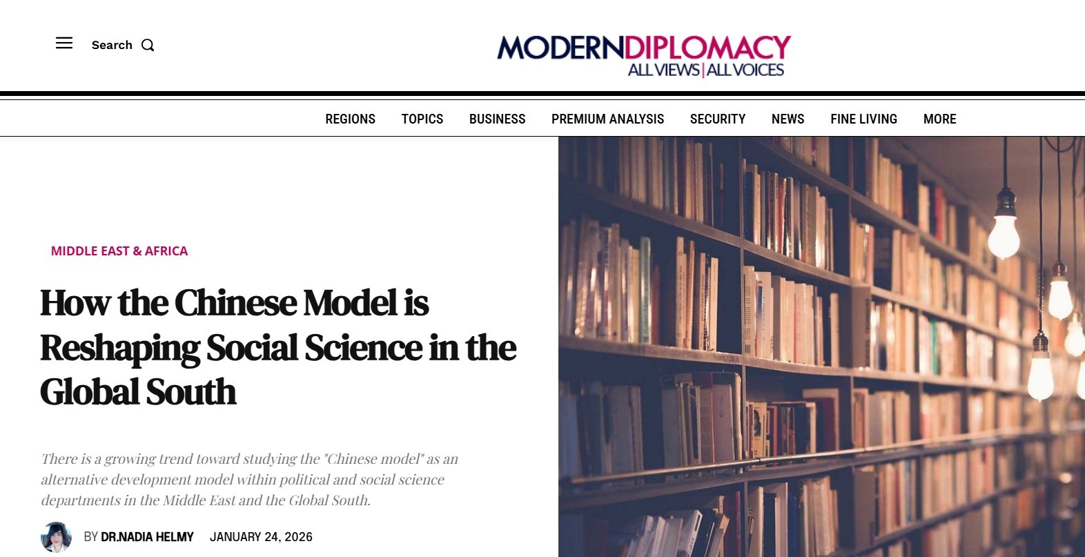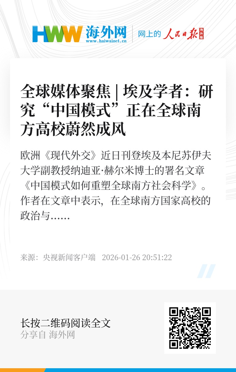 欧洲《现代外交》近日刊登埃及本尼苏伊夫大学副教授纳迪亚·赫尔米博士的署名文章《中国模式如何重塑全球南方社会科学》。作者在文章中表示, 在全球南方国家高校的政治与社会科学院系中,将“中国模式”作为一种替代发展模式展开研究的趋势正日益凸显。