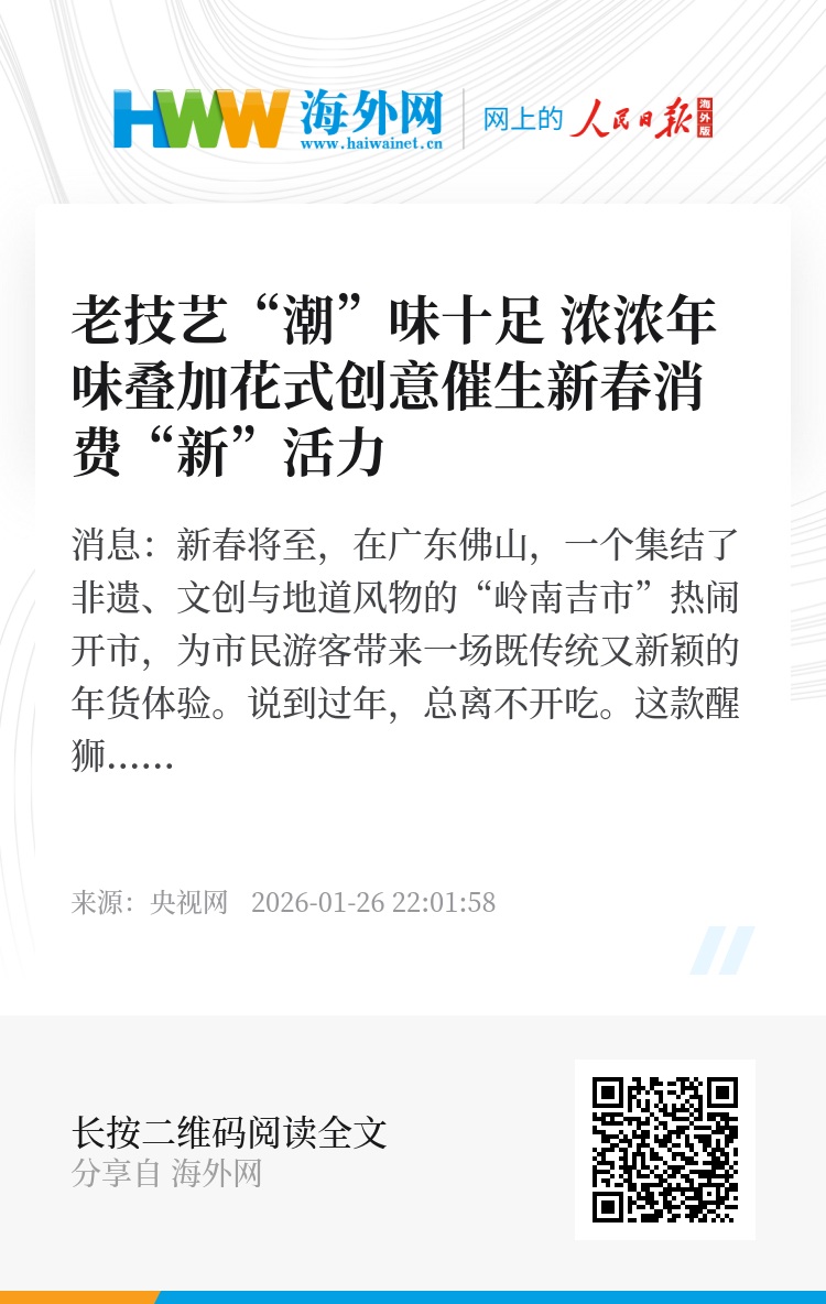 央视网消息:新春将至,在广东佛山,一个集结了非遗、文创与地道风物的“岭南吉市”热闹开市,为市民游客带来一场既传统又新颖的年货体验。