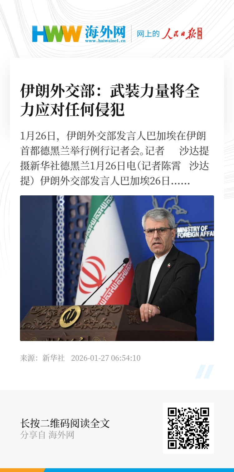 新华社德黑兰1月26日电(记者陈霄 沙达提)伊朗外交部发言人巴加埃26日说,伊朗武装力量将全力应对任何侵犯,作出令侵犯者“后悔”的回应。