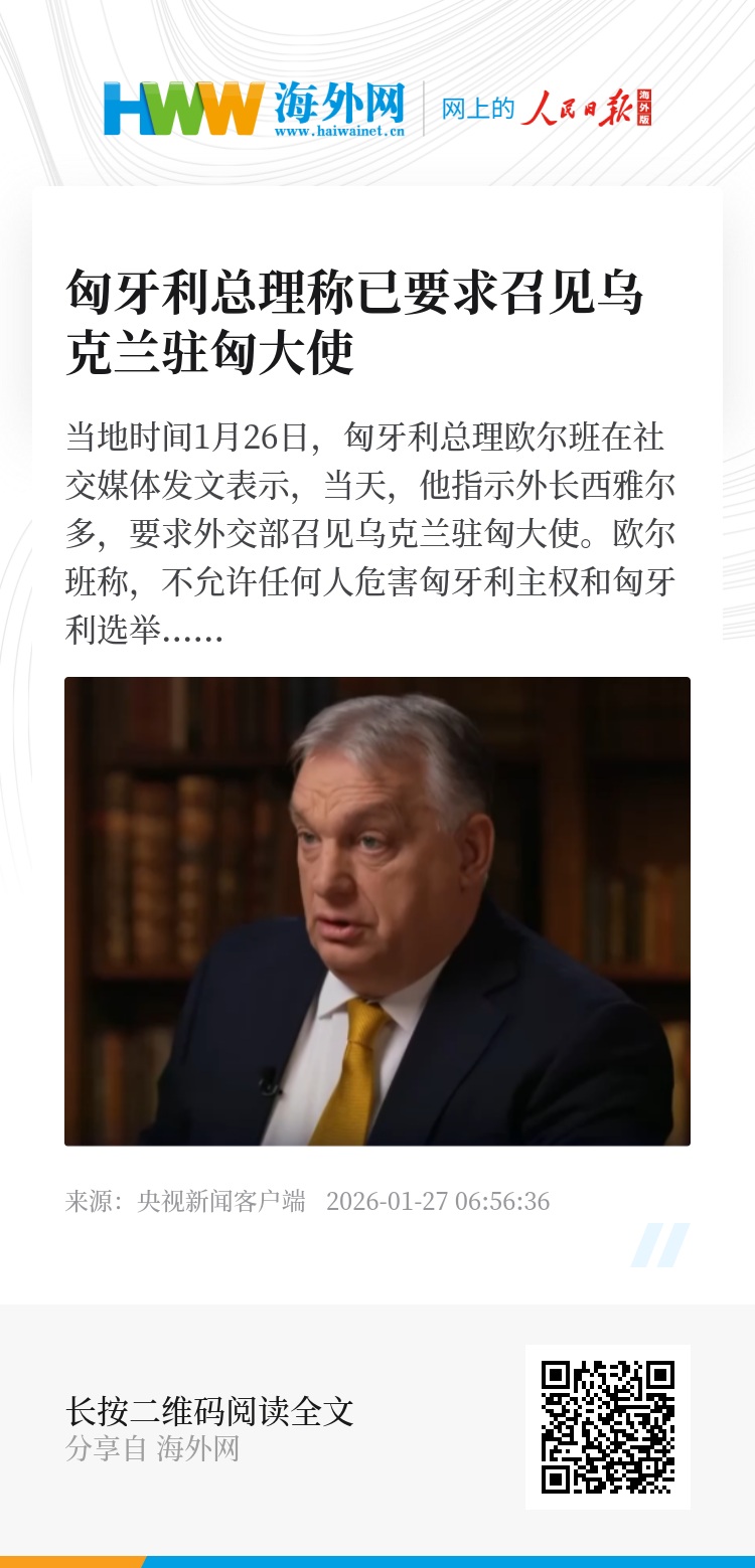 当地时间1月26日,匈牙利总理欧尔班在社交媒体发文表示,当天,他指示外长西雅尔多,要求外交部召见乌克兰驻匈大使。欧尔班称,不允许任何人危害匈牙利主权和匈牙利选举公正性。