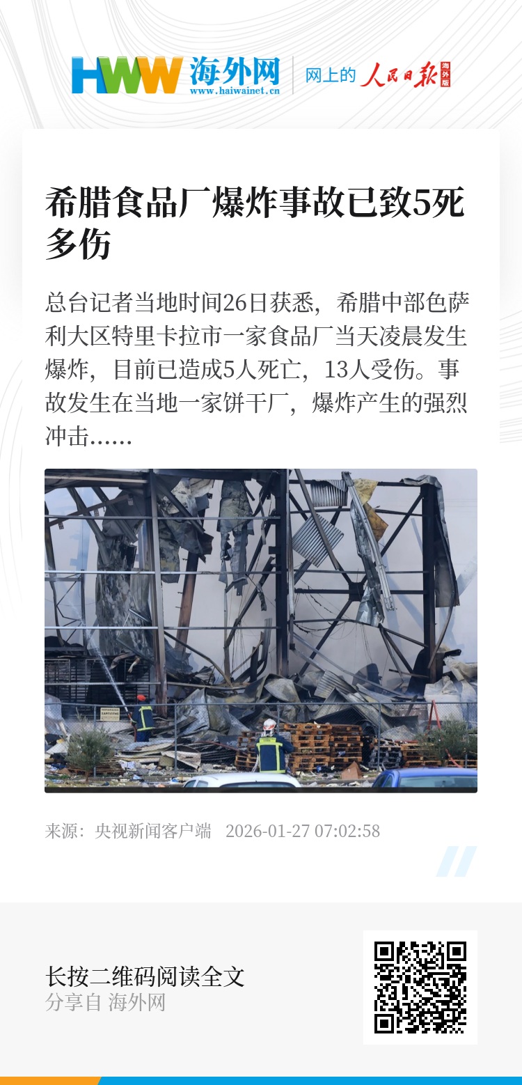 总台记者当地时间26日获悉,希腊中部色萨利大区特里卡拉市一家食品厂当天凌晨发生爆炸,目前已造成5人死亡,13人受伤。