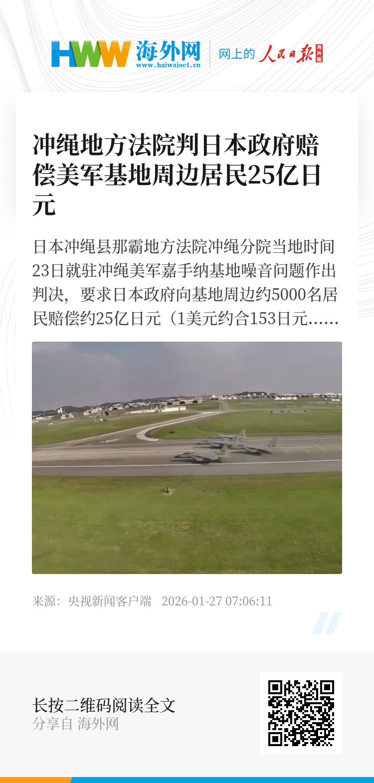 日本冲绳县那霸地方法院冲绳分院当地时间23日就驻冲绳美军嘉手纳基地噪音问题作出判决,要求日本政府向基地周边约5000名居民赔偿约25亿日元(1美元约合153日元)。