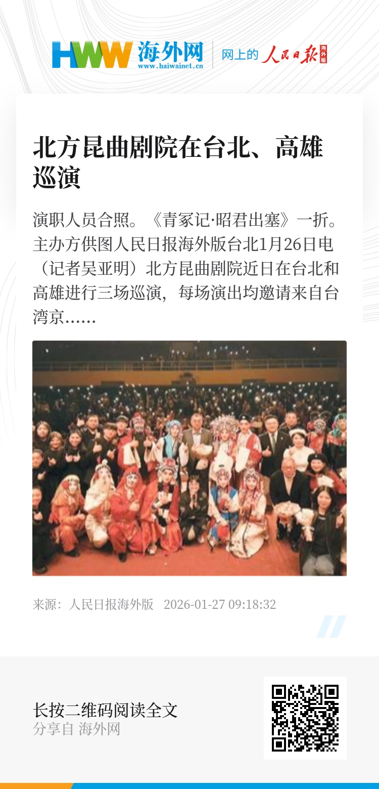 人民日报海外版台北1月26日电(记者吴亚明)北方昆曲剧院近日在台北和高雄进行三场巡演,每场演出均邀请来自台湾京昆艺术推广协会的演员同台演绎,通过两岸昆曲表演者不同诠释方式的交融,呈现传统戏曲艺术丰富多元的面貌。