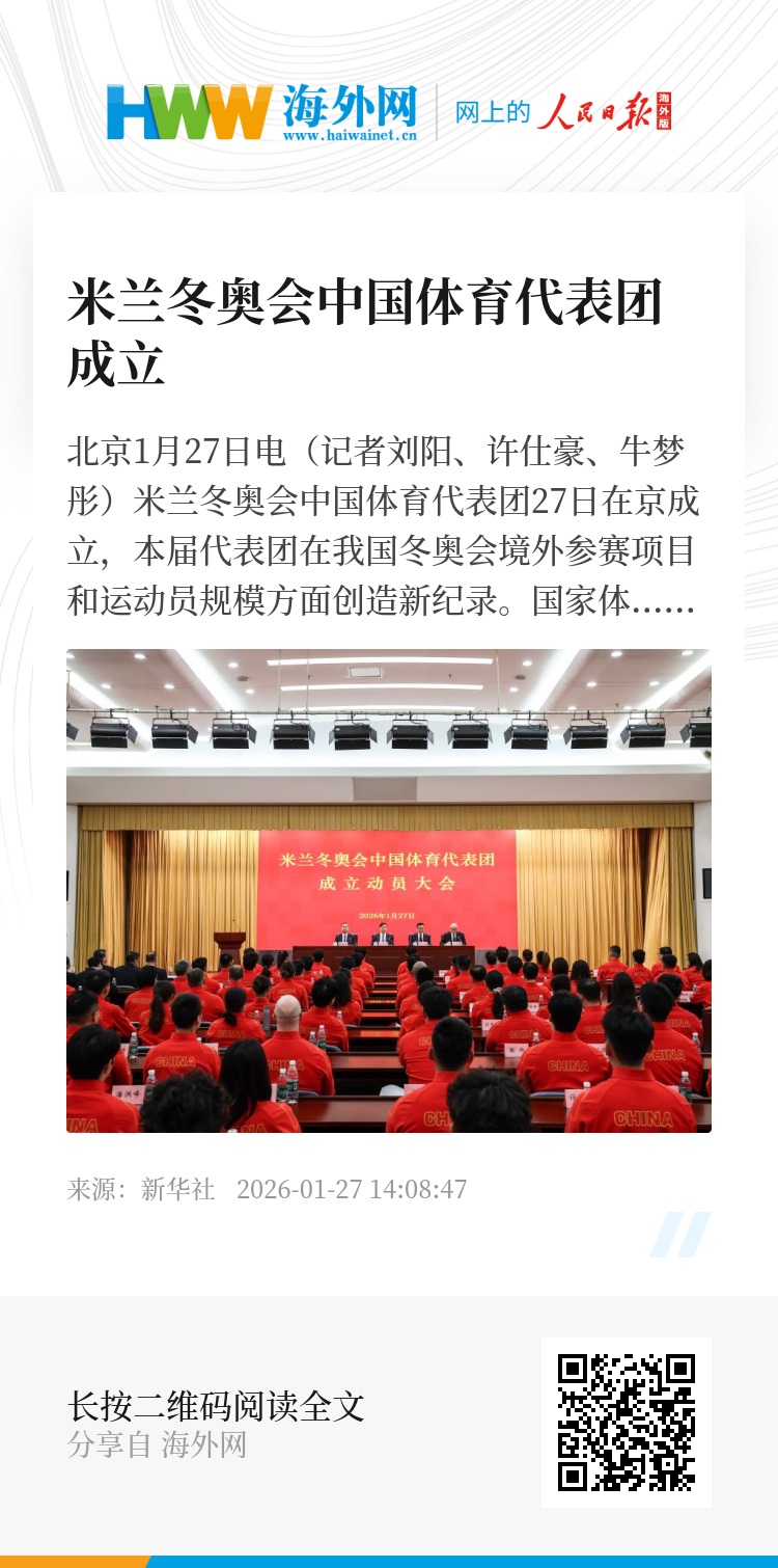 新华社北京1月27日电(记者刘阳、许仕豪、牛梦彤)米兰冬奥会中国体育代表团27日在京成立,本届代表团在我国冬奥会境外参赛项目和运动员规模方面创造新纪录。国家体育总局局长、代表团团长高志丹表示,代表团以实现运动成绩和精神文明双丰收为根本目标,全力以赴完成米兰冬奥会参赛任务。