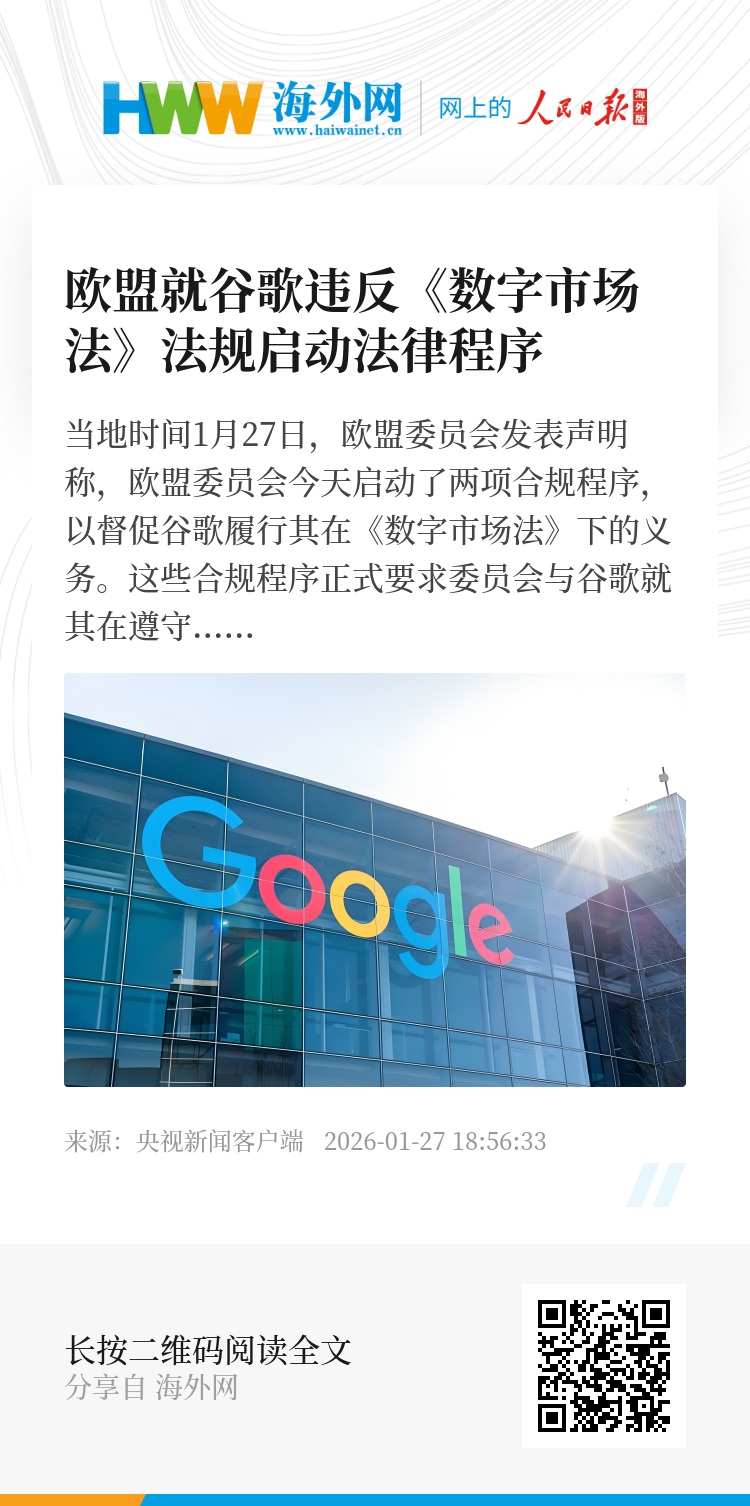 当地时间1月27日,欧盟委员会发表声明称,欧盟委员会今天启动了两项合规程序,以督促谷歌履行其在《数字市场法》下的义务。这些合规程序正式要求委员会与谷歌就其在遵守《数字市场法》两项义务中展开监管对话。