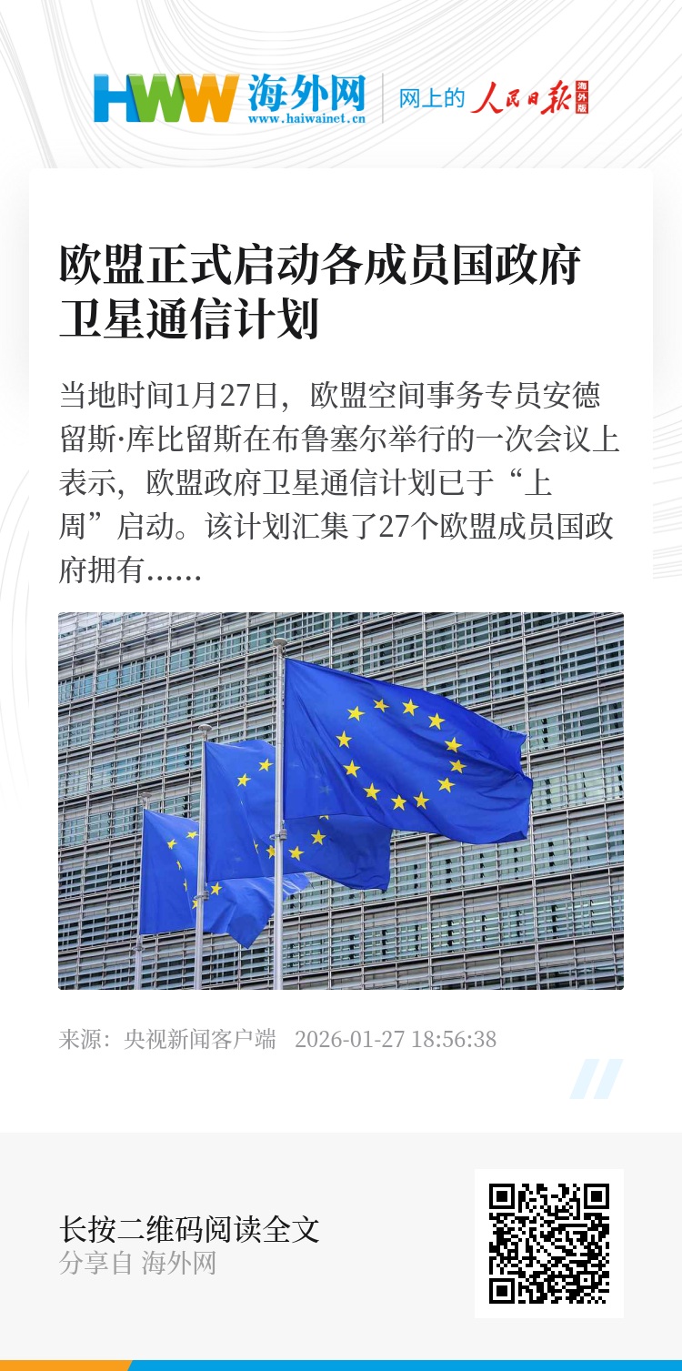 当地时间1月27日,欧盟空间事务专员安德留斯·库比留斯在布鲁塞尔举行的一次会议上表示,欧盟政府卫星通信计划已于“上周”启动。该计划汇集了27个欧盟成员国政府拥有的卫星的现有通信能力。