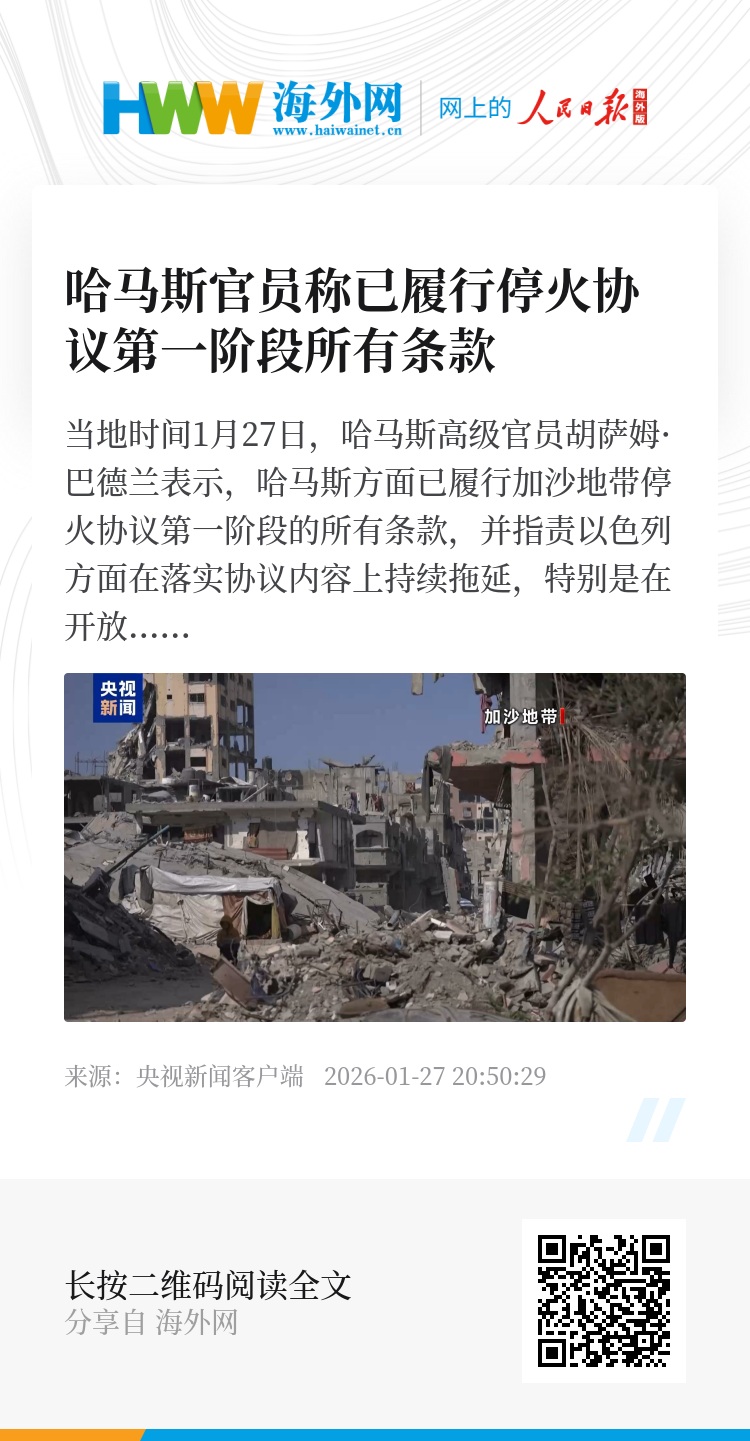 当地时间1月27日,哈马斯高级官员胡萨姆·巴德兰表示,哈马斯方面已履行加沙地带停火协议第一阶段的所有条款,并指责以色列方面在落实协议内容上持续拖延,特别是在开放拉法口岸和从被占地区撤出方面。