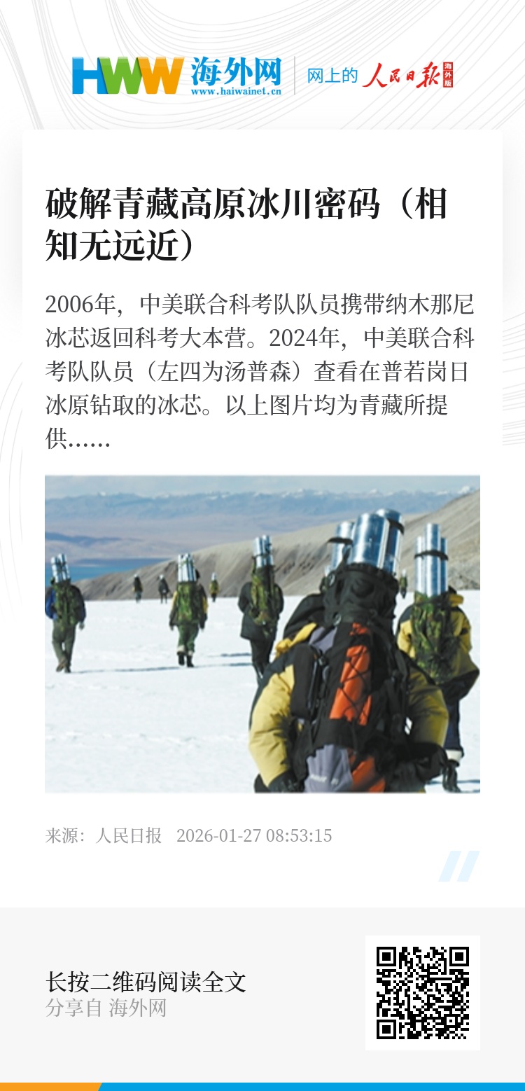 汤普森经常将高原上的冰川比作矿井里的金丝雀。“当金丝雀停止鸣叫时,矿工们就知道该离开矿井了。就像金丝雀一样,冰川也在警告我们危险的温室气体的积聚。”他说,“冰川融化不会因为国界而止步。每一次上冰,都是在与时间赛跑,与冰川消融的速度赛跑。期待与中国科学家一起,在青藏高原书写更多精彩的科考故事,共同保护我们的地球。”(记者 张博岚 王骁波)