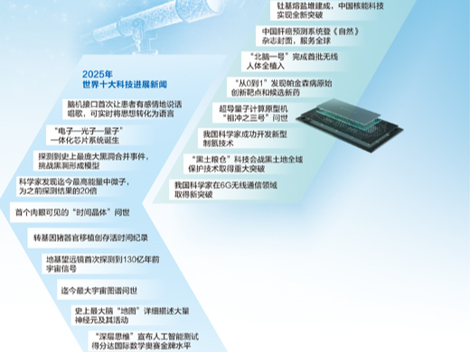 2025年世界十大科技进展新闻分别是:脑机接口首次让患者有感情地说话唱歌,可实时将思想转化为语言;“电子—光子—量子”一体化芯片系统诞生;探测到史上最庞大黑洞合并事件,挑战黑洞形成模型;科学家发现迄今最高能量中微子,为之前探测结果的20倍;首个肉眼可见的“时间晶体”问世;转基因猪器官移植创存活时间纪录;地基望远镜首次探测到130亿年前宇宙信号;迄今最大宇宙图谱问世;史上最大脑“地图”详细描述大量神经元及其活动;“深层思维”宣布人工智能测试得分达国际数学奥赛金牌水平。