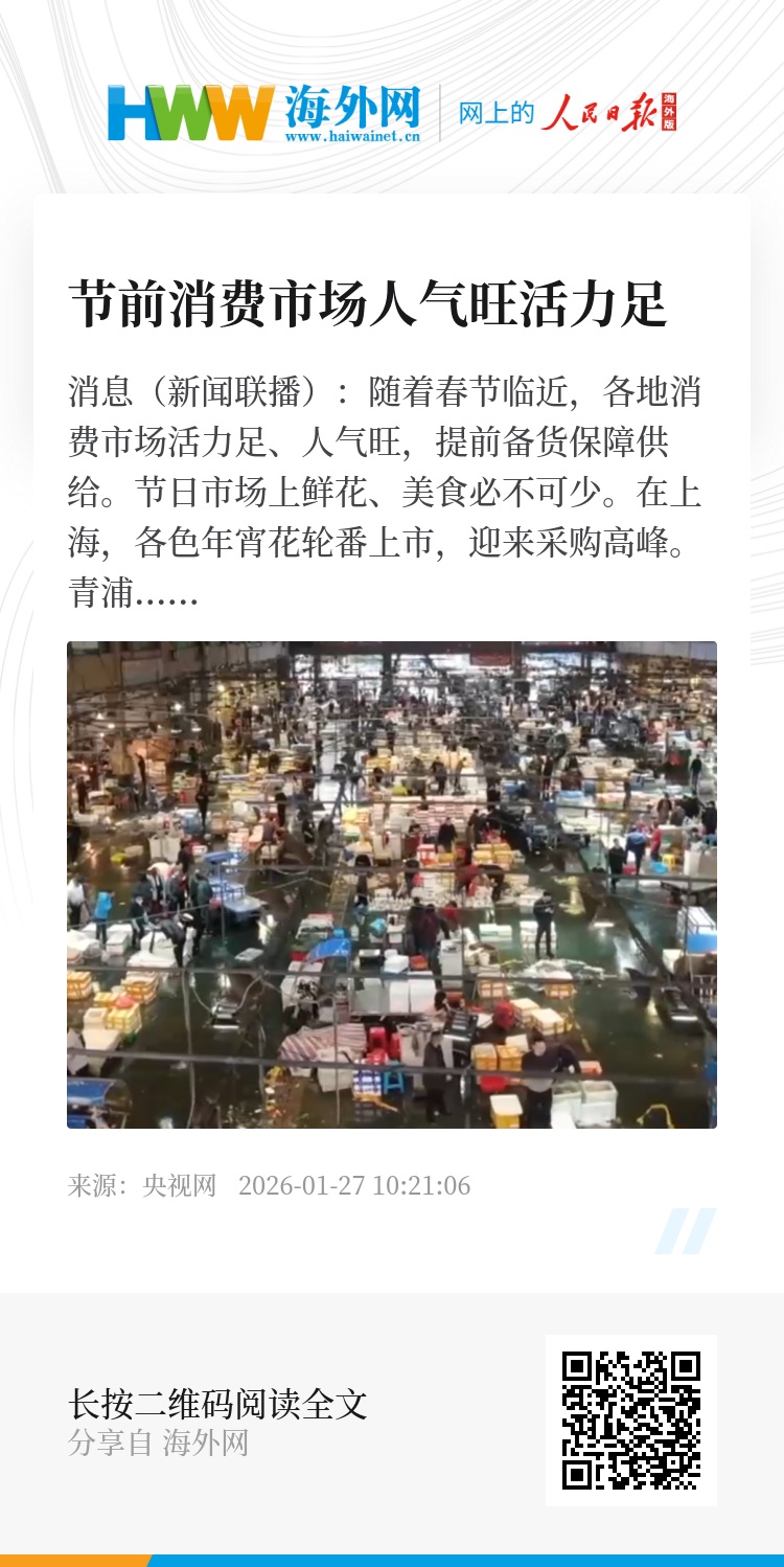央视网消息(新闻联播):随着春节临近,各地消费市场活力足、人气旺,提前备货保障供给。