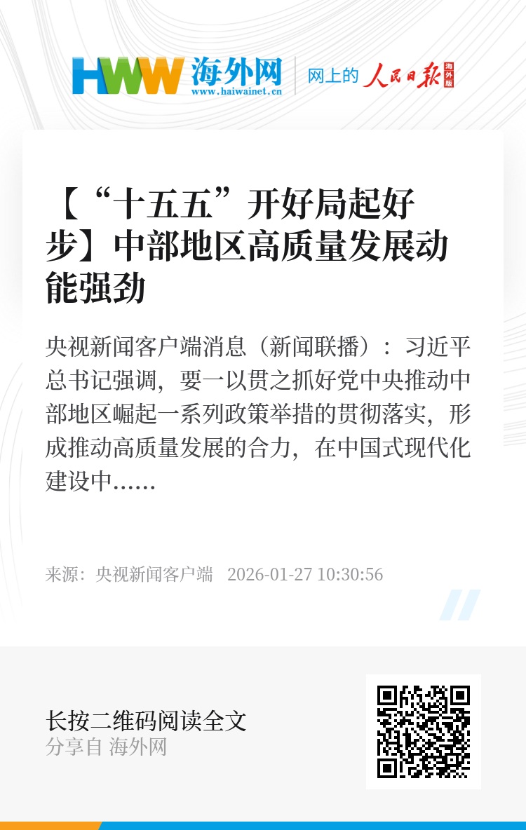 央视新闻客户端消息(新闻联播):习近平总书记强调,要一以贯之抓好党中央推动中部地区崛起一系列政策举措的贯彻落实,形成推动高质量发展的合力,在中国式现代化建设中奋力谱写中部地区崛起新篇章。“十五五”开局之年,中部六省坚持创新驱动发展,加快构建现代化产业体系,持续打造更具竞争力的开放高地,在更高起点上扎实推动中部地区崛起。