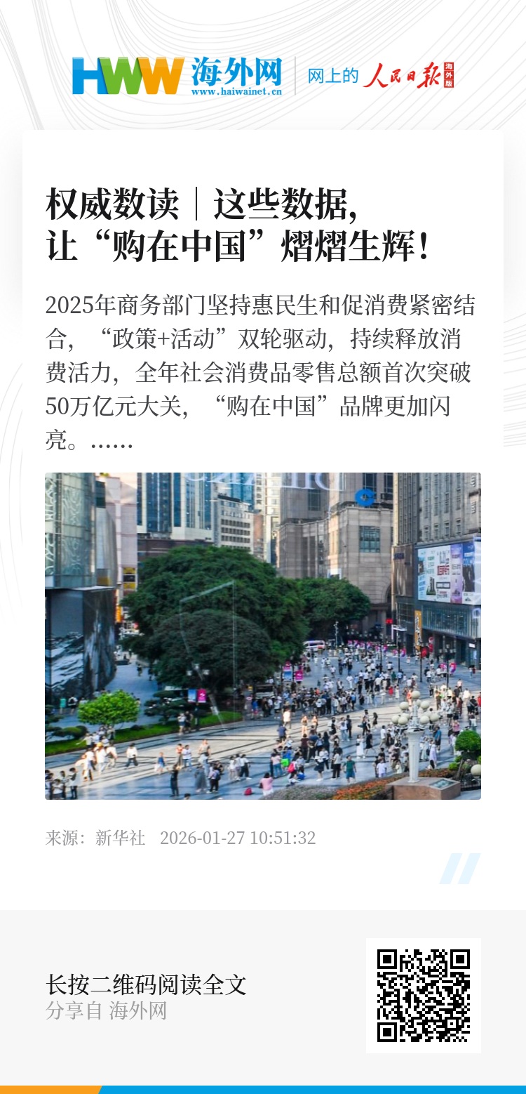 2025年商务部门坚持惠民生和促消费紧密结合,“政策+活动”双轮驱动,持续释放消费活力,全年社会消费品零售总额首次突破50万亿元大关,“购在中国”品牌更加闪亮。跟随海报,一起来看看。