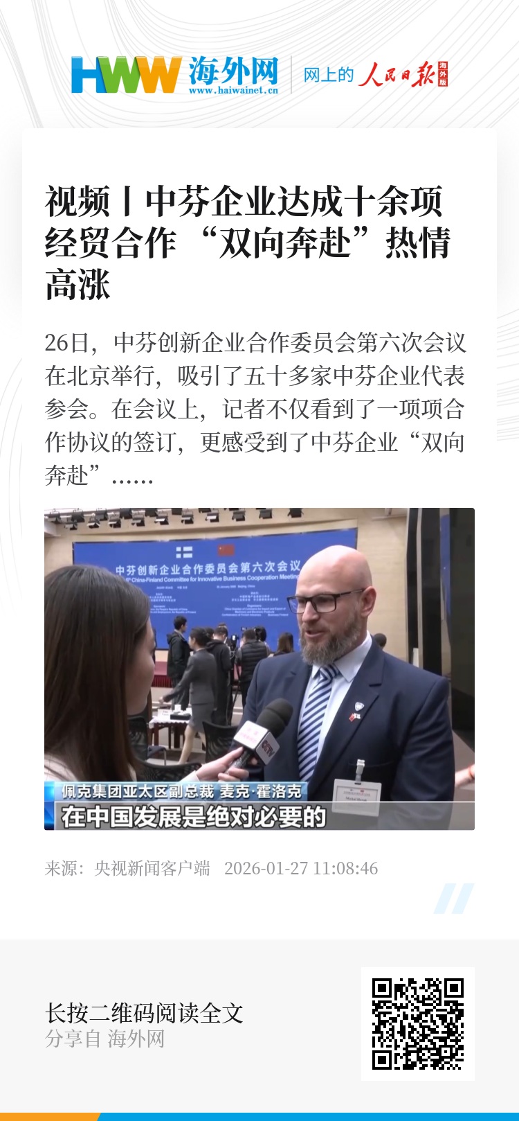 总台央视记者 高媛:在会议的现场,最大的感受就是热切,芬兰企业和中国企业代表抓住每一个机会进行交流,许多芬兰企业家表示,他们要留在中国一周甚至几周,去寻找更多的合作机会。