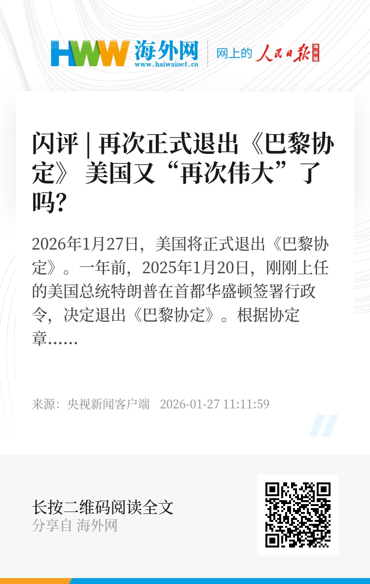 2026年1月27日,美国将正式退出《巴黎协定》。一年前,2025年1月20日,刚刚上任的美国总统特朗普在首都华盛顿签署行政令,决定退出《巴黎协定》。根据协定章程规定,美国将在提交申请后一年正式退出该协定。