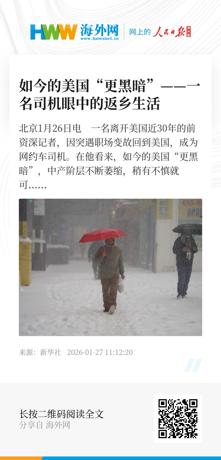 新华社北京1月26日电 一名离开美国近30年的前资深记者,因突遇职场变故回到美国,成为网约车司机。在他看来,如今的美国“更黑暗”,中产阶层不断萎缩,稍有不慎就可能陷入更糟的境遇。