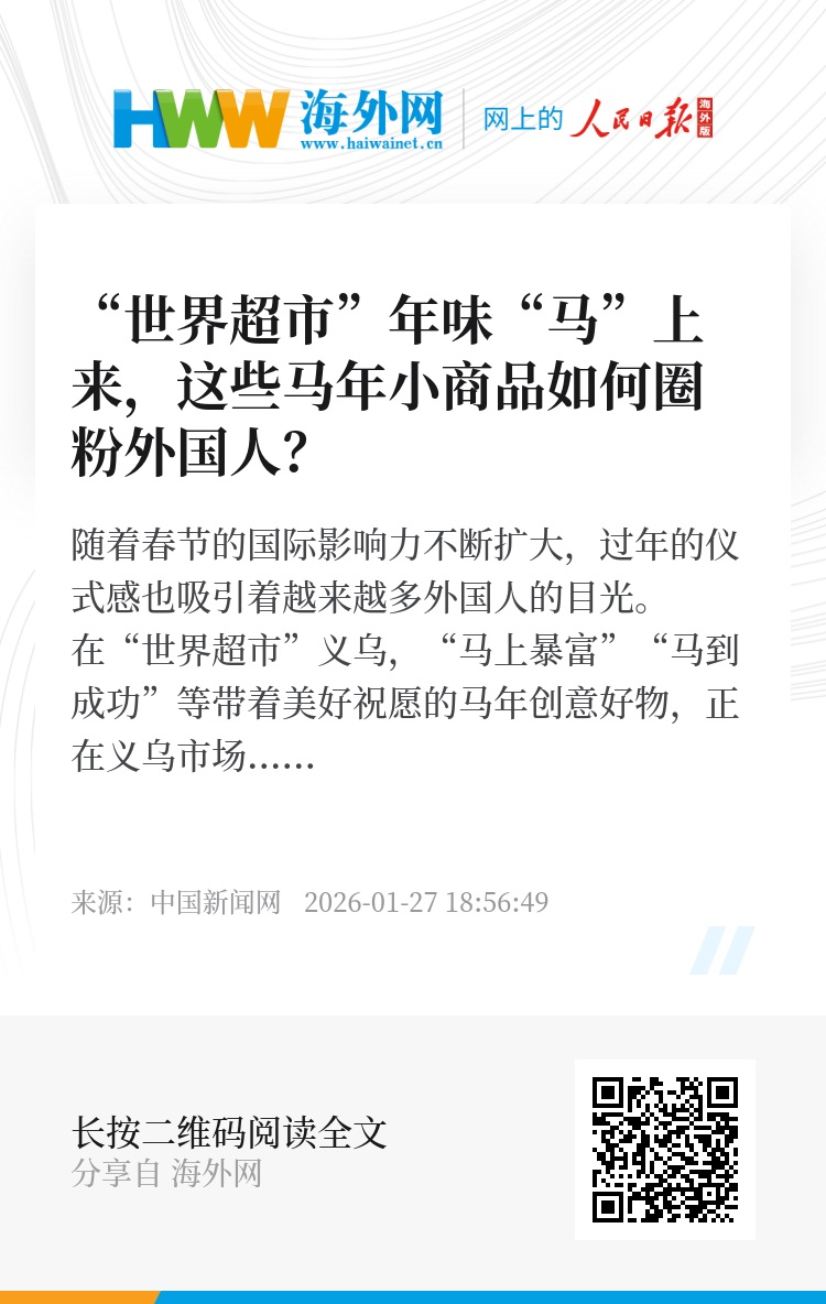 随着春节的国际影响力不断扩大,过年的仪式感也吸引着越来越多外国人的目光。在“世界超市”义乌,“马上暴富”“马到成功”等带着美好祝愿的马年创意好物,正在义乌市场热销,成为不少外商采购清单里的“新宠”。